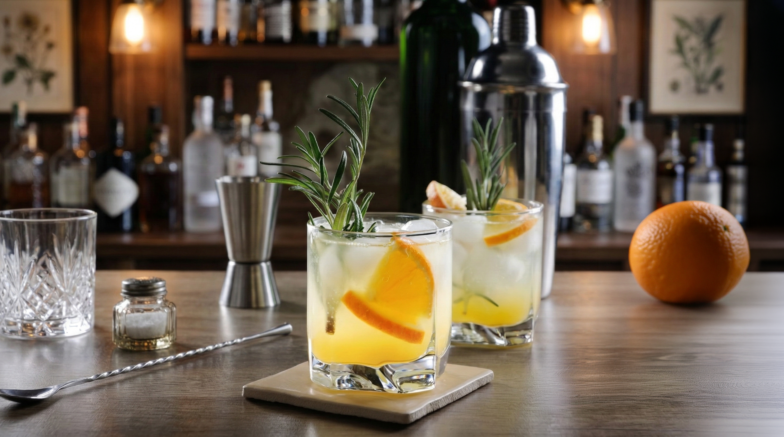 Add Bored Vodka, orange juice, honey syrup, and ice into a tin and shake vigorously… slip orange slice into glass, add to dashes of bitters, and finish with rosemary garnish.